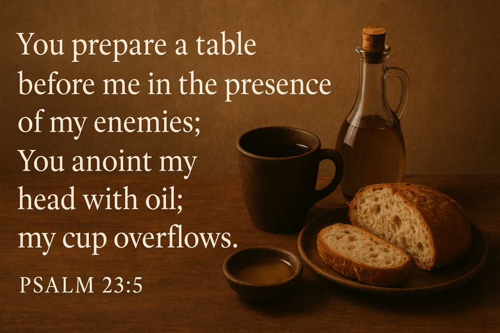 The psalm then shifts from the journey to the destination. The shepherd prepares a place of honour and healing. Every need is met. Oil soothes what is wounded. A full cup answers every thirst. Goodness and mercy do not fade but stay close through every season. The path does not lead into emptiness; it leads home. The promise is not just help for this life but a place with God forever.